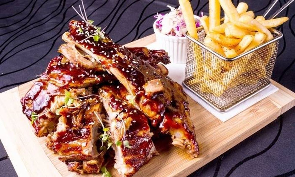 coaste de porc marinate 330g, sos barbeque 20g, mirodenii 3g, cartofi prajiti 150g